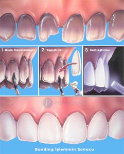 Bonding İşlemi: Bonding uygulanacak dişin yüzeyi pürüzlendirilerek bir kondisyon sıvısı uygulanır, bu yapıştırıcı malzemenin dişe yapışmasını sağlamaktadır. Ardından diş rengindeki yapıştırıcı malzeme uygulanarak sertleşmeden önce istenen şekle getirilir. Bağlama malzemesini sertleştirmek için genellikle bir lazer veya parlak ışık kullanılır. Yapıştırma malzemesi sertleştikten sonra diş hekimi tarafından şekillendirilebilir ve kesilebilir. Diş hekimi daha sonra kalan diş yüzeyinin gölgesine ve parlaklığına mükemmel bir şekilde uyması için onu parlatır.